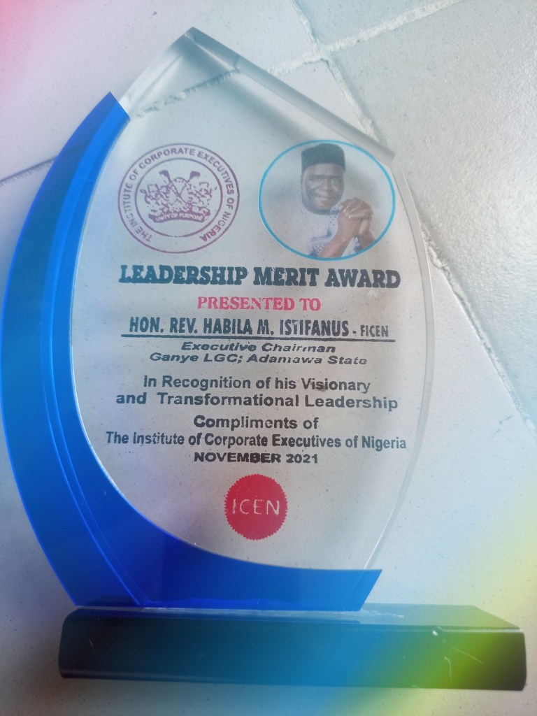 The Executive chairman of Ganye Local Government council and the president JPRM Board of Trustee (KATUKAN GANYE) Rev. Dr. Habila M. Istifanus has won a Leadership Merit award in recognition to his visionary and Transformational Leadership evince. The award was presented to him by the Institute of corporate Executives of Nigeria at the Federal Secretariat in Adamawa State, on the 4th November, 2021 where he was hailed for his selfless service to humanity. The award was the highlight of a one-day conference where other selected patriotic figures were equally awarded. The award serves to recognise and encourage icons like Rev. Habila who many described as an outstanding leader who has done a lot to humanity. Habila was described as a patron saint of patriotism, an altruist and a harbinger of change, who curate many developmental projects that impacted positively in the lives of the masses both in government and private.