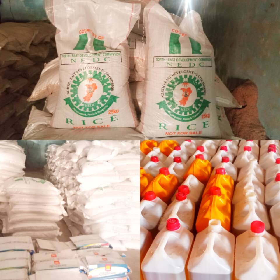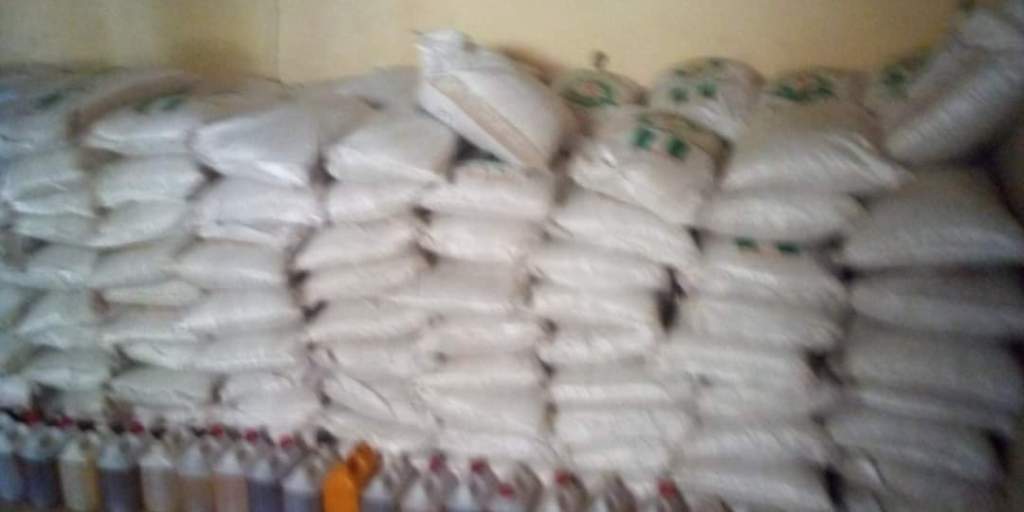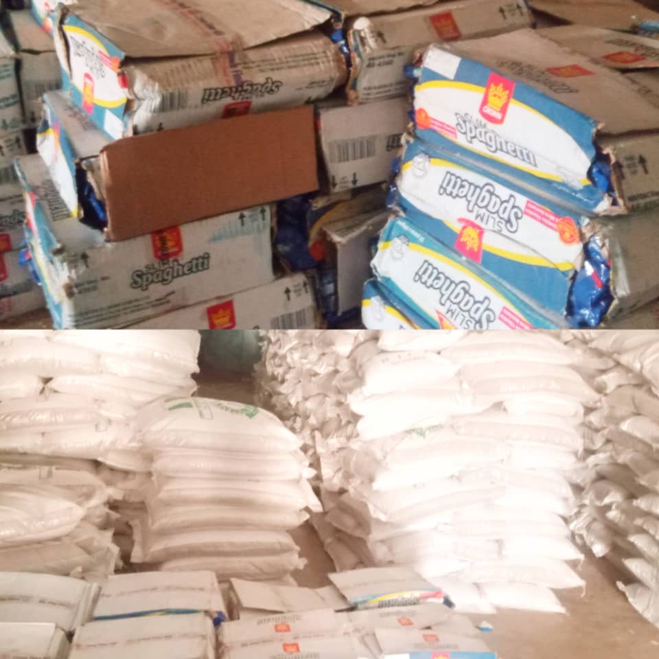 The food items distributed include bags of rice, cartons of macaroni and spaghetti as well as vegetable oil, etc.