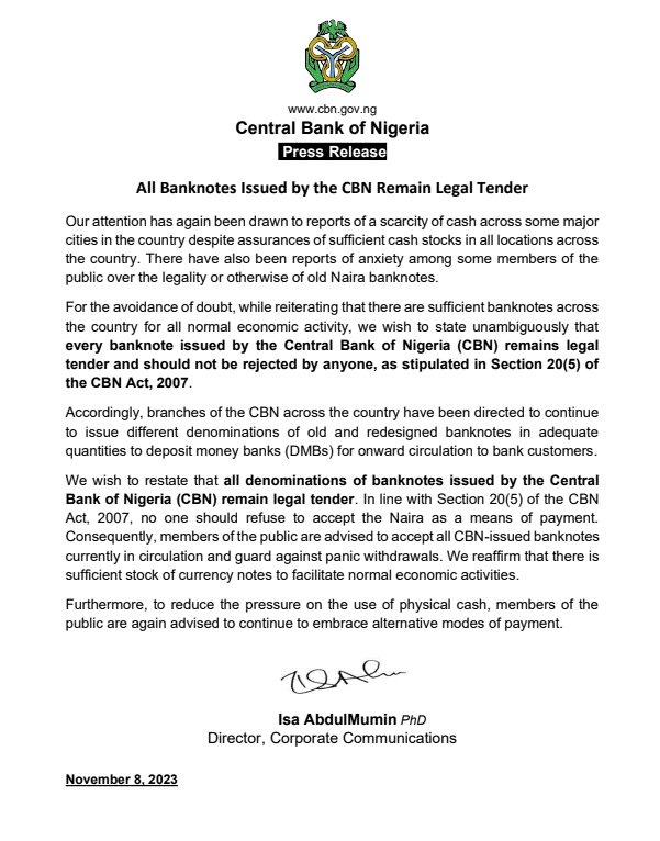 “We wish to restate that all denominations of banknotes issued by the Central Bank of Nigeria (CBN) remain legal tender. In line with Section 20(5) of the CBN Act 2007, no one should refuse to accept the Naira as a means of payment.