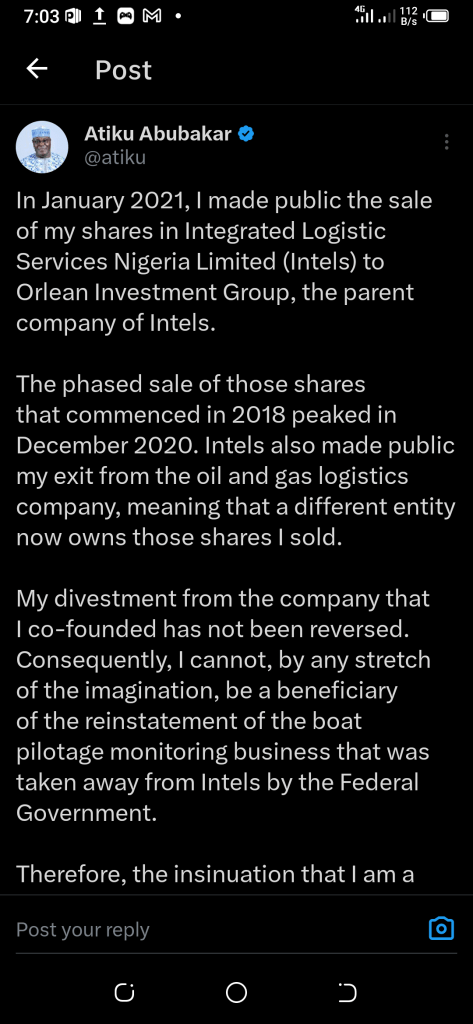 A former Vice President and presidential candidate of the Peoples Democratic Party (PDP) in the 2023 general elections, Atiku Abubakar, has denied having shares in or having anything to do with Integrated Logistic Services Nigeria Limited (Intels).