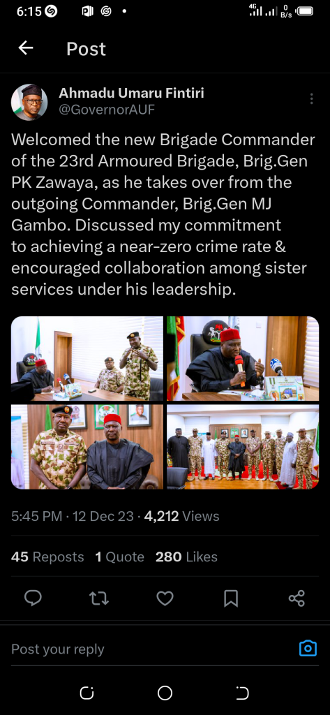 Governor Fintiri further encouraged the new Brigade Commander to create a better synergy with the government and other sister security agencies to ensure a zero-crime rate in the state.