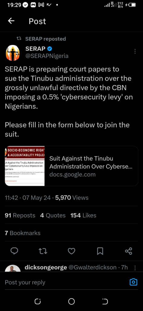 The Socio-Economic Rights and Accountability Project (SERAP) has threatened to sue the Nigerian Government over the 0.5 per cent cybersecurity levy imposed by the Central Bank of Nigeria.