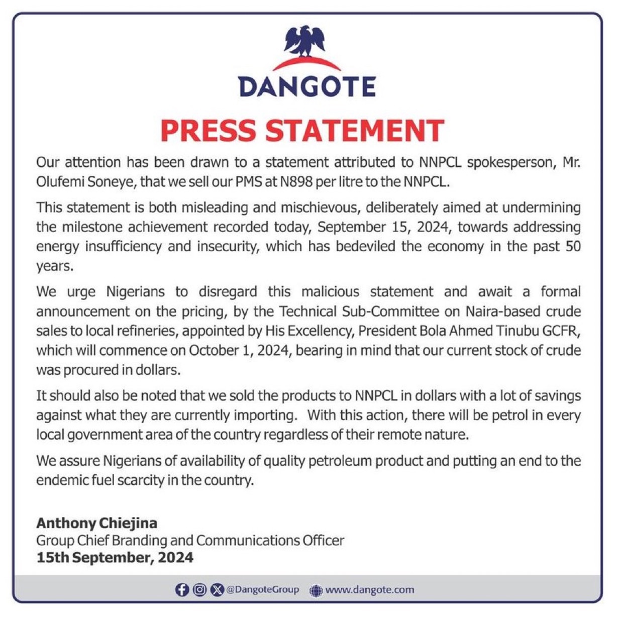 In a swift response to circulating reports, Dangote Refinery has officially denied allegations of selling fuel to the Nigerian National Petroleum Corporation (NNPC) at an inflated price of N898 per liter. The refinery, through a statement shared on its official X handle, firmly labeled the claims as both “misleading” and “mischievous.”