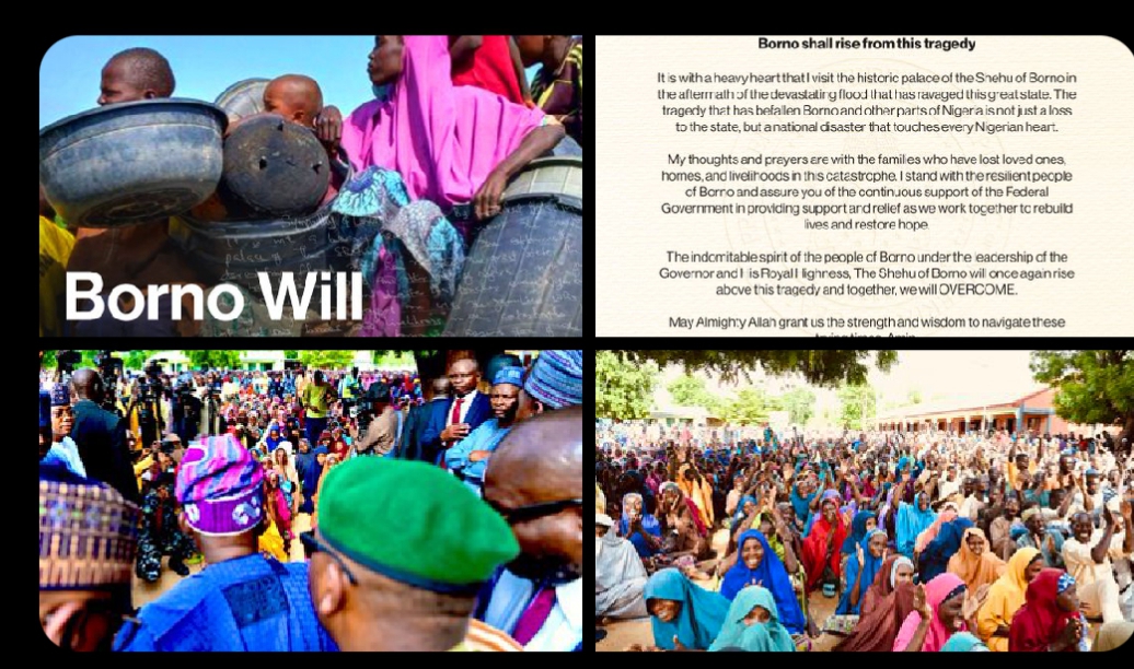 In a heartfelt message shared on his official X (formerly Twitter) handle, President Bola Ahmed Tinubu expressed deep sympathy and unwavering support for the people of Borno State, who have been affected by the devastating floods that have claimed lives and destroyed homes. During his visit to the state, the President assured the victims of the government’s firm commitment to providing both immediate relief and long-term recovery efforts.