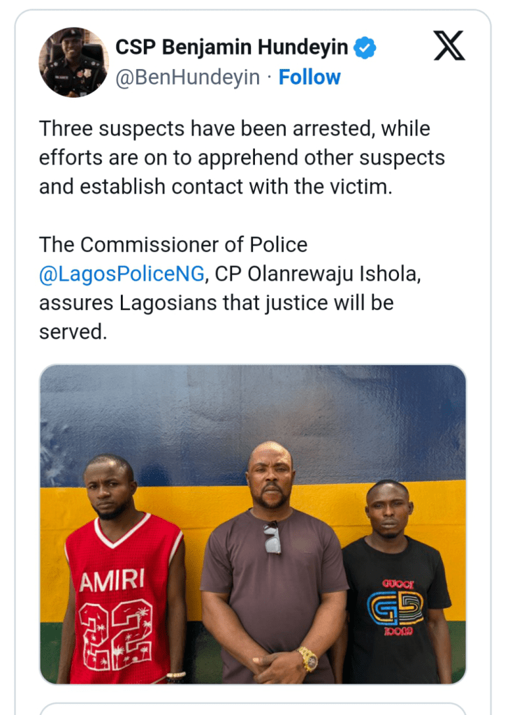 “Three suspects have been arrested, while efforts are on to apprehend other suspects and establish contact with the victim,” Hundeyin announced in a post on X (formerly Twitter).