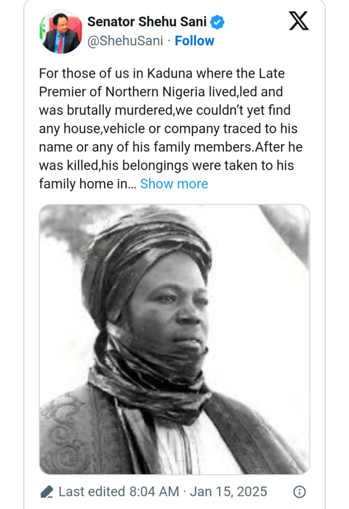 “For those of us in Kaduna, where the Late Premier of Northern Nigeria lived, led, and was brutally murdered, we couldn’t yet find any house, vehicle, or company traced to his name or any of his family members,” Sani noted in his post. He further revealed that after Bello’s tragic death, his modest belongings were returned to his family home in Sokoto.