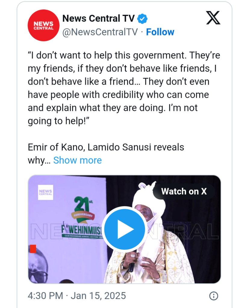 Sanusi’s remarks add to growing concerns about the Tinubu administration’s handling of Nigeria’s economic crisis, which has been marked by rising inflation, subsidy removal, and foreign exchange challenges. His decision to withhold advice reflects a broader sentiment of frustration among stakeholders who believe the government must earn the trust and support of credible voices to navigate the nation’s troubled waters.