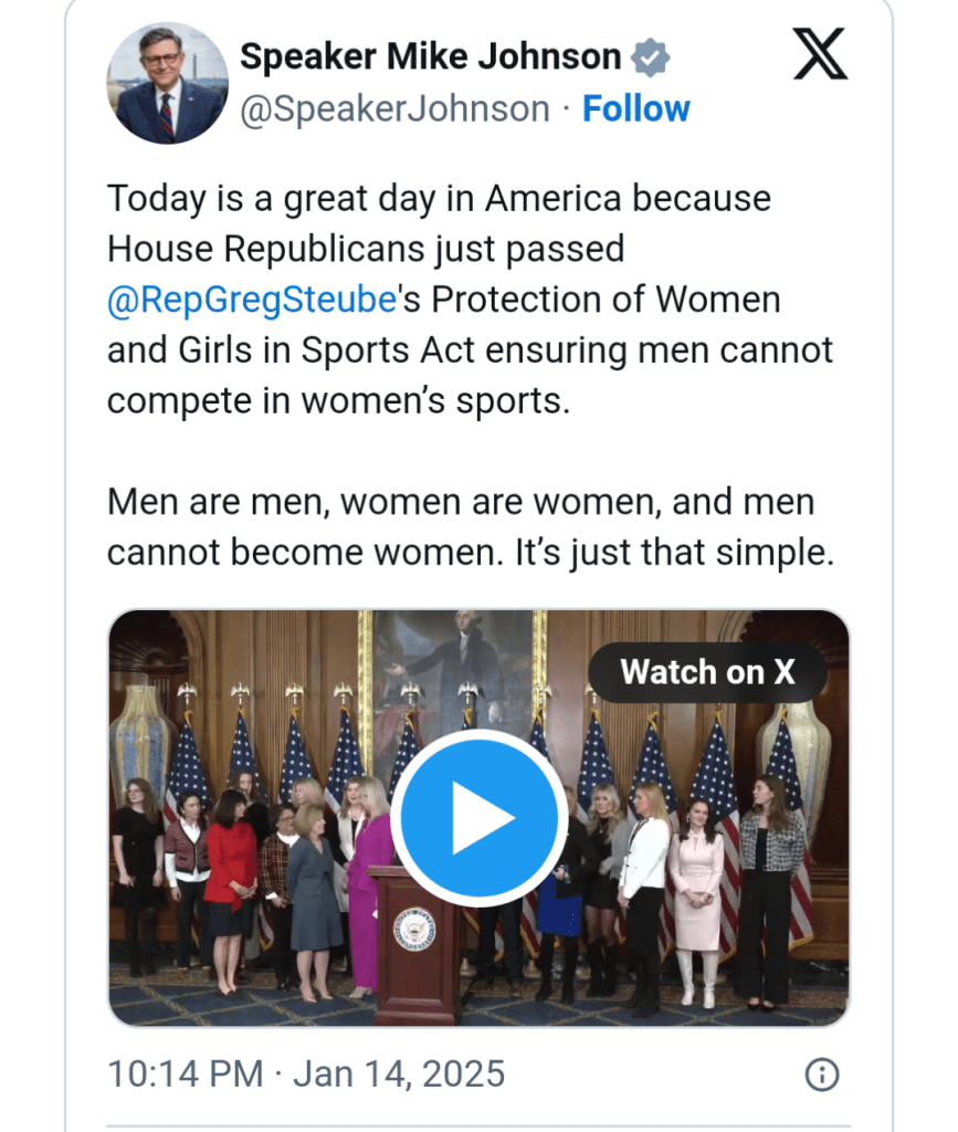 “Today is a great day in America because House Republicans just passed @RepGregSteube’s Protection of Women and Girls in Sports Act, ensuring men cannot compete in women’s sports,” Johnson declared in a post. “Men are men, women are women, and men cannot become women. It’s just that simple.”