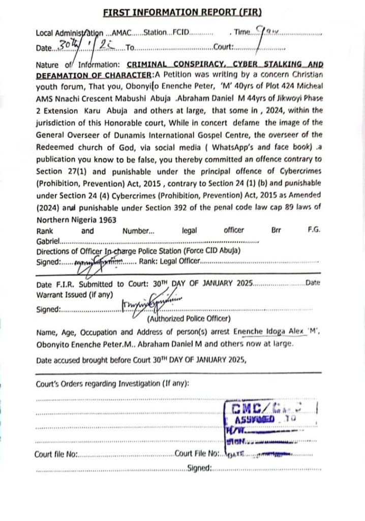 The FIR was signed by Barrister F.G. Gabriel, Officer-in-Charge, Force CID Abuja.