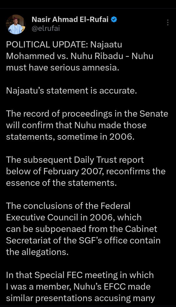 As the political drama unfolds, former Kaduna State Governor Nasir El-Rufai has thrown his weight behind Naja’atu Mohammed, confirming her claim that National Security Adviser (NSA) Nuhu Ribadu once accused President Bola Tinubu of being “the most corrupt politician” during a 2006 Federal Executive Council (FEC) meeting.