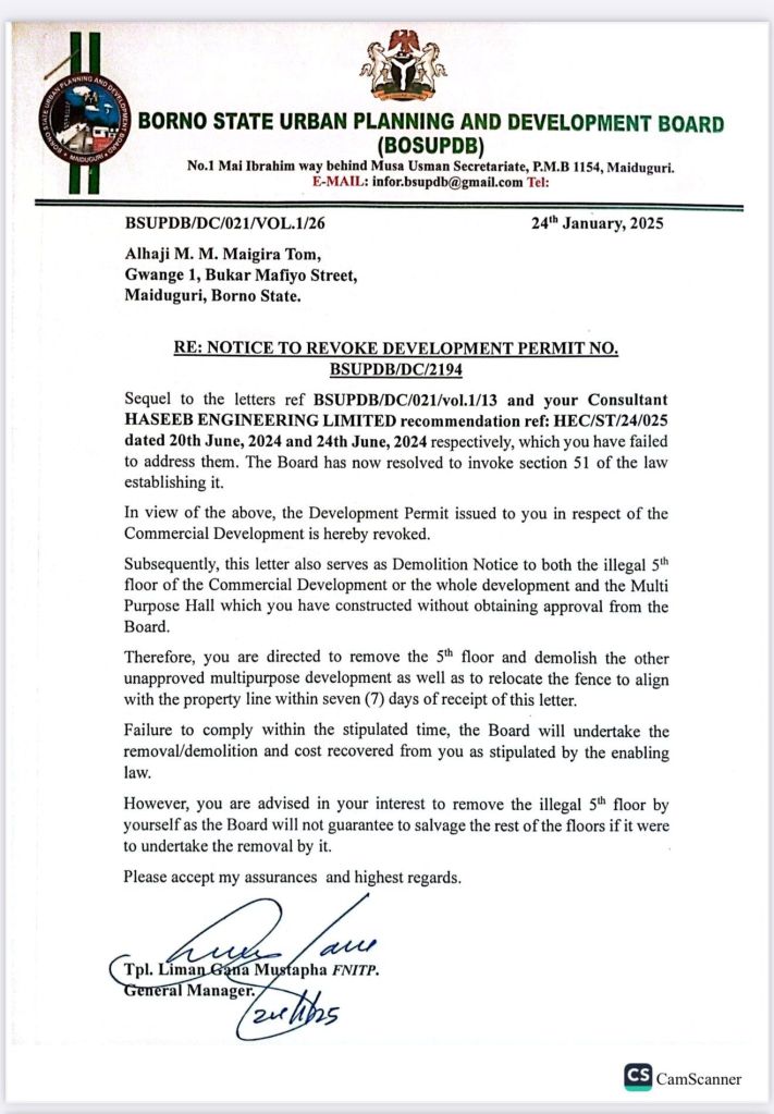 Adding to the legal battle, the Borno State Urban Planning and Development Board (BOUPDB) issued a notice of revocation for a development permit previously granted to Magira. The agency, in a letter dated January 24, 2025, cited failure to comply with planning regulations as the reason for the permit’s withdrawal.