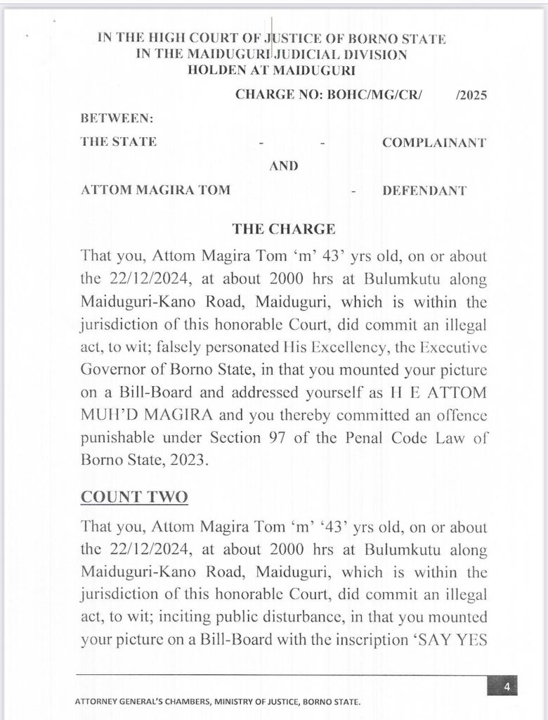 The first charge alleges that Magira “falsely personated His Excellency, the Executive Governor of Borno State” by featuring himself on a billboard with the title “HE Attom Muh’d Magira.” Prosecutors claim this act violates Section 97 of the Penal Code Law of Borno State, 2023.