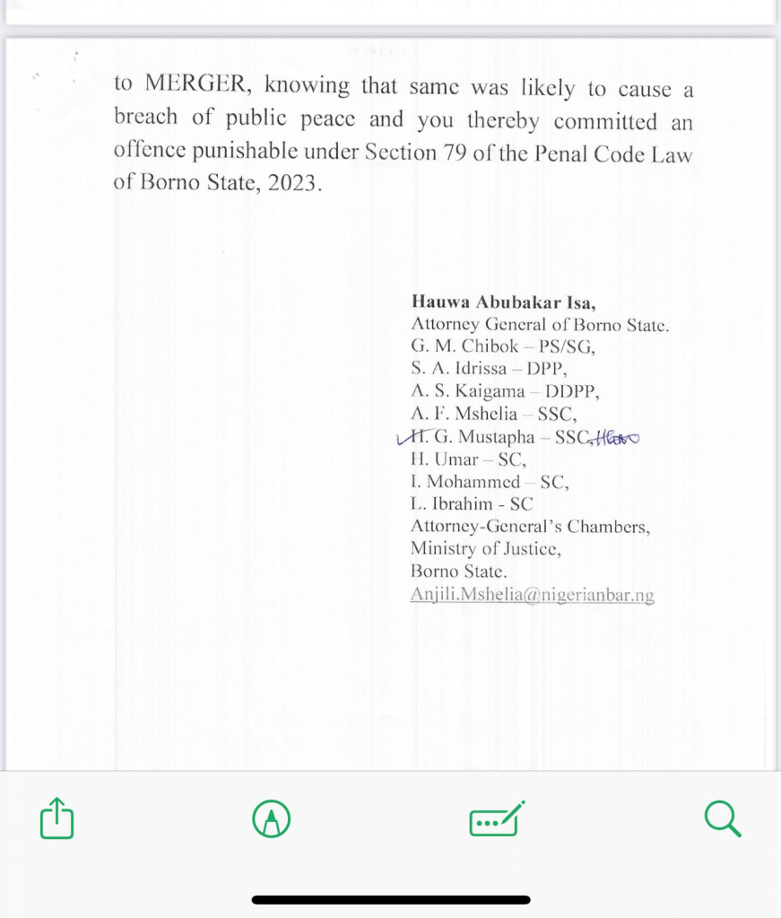 The second charge accuses him of inciting public disturbance by displaying a billboard with the inscription “SAY YES TO MERGER,” suggesting an alliance that the government claims could breach public peace. This is said to contravene Section 79 of the Penal Code Law of Borno State, 2023.