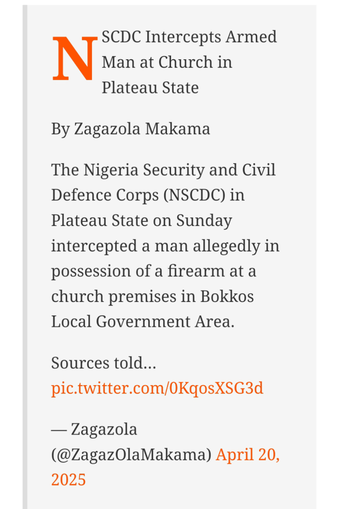 In a shocking twist that disrupted a quiet Sunday morning worship, operatives of the Nigeria Security and Civil Defence Corps (NSCDC) in Plateau State apprehended a man allegedly in possession of a firearm within the premises of a church in Bokkos Local Government Area.