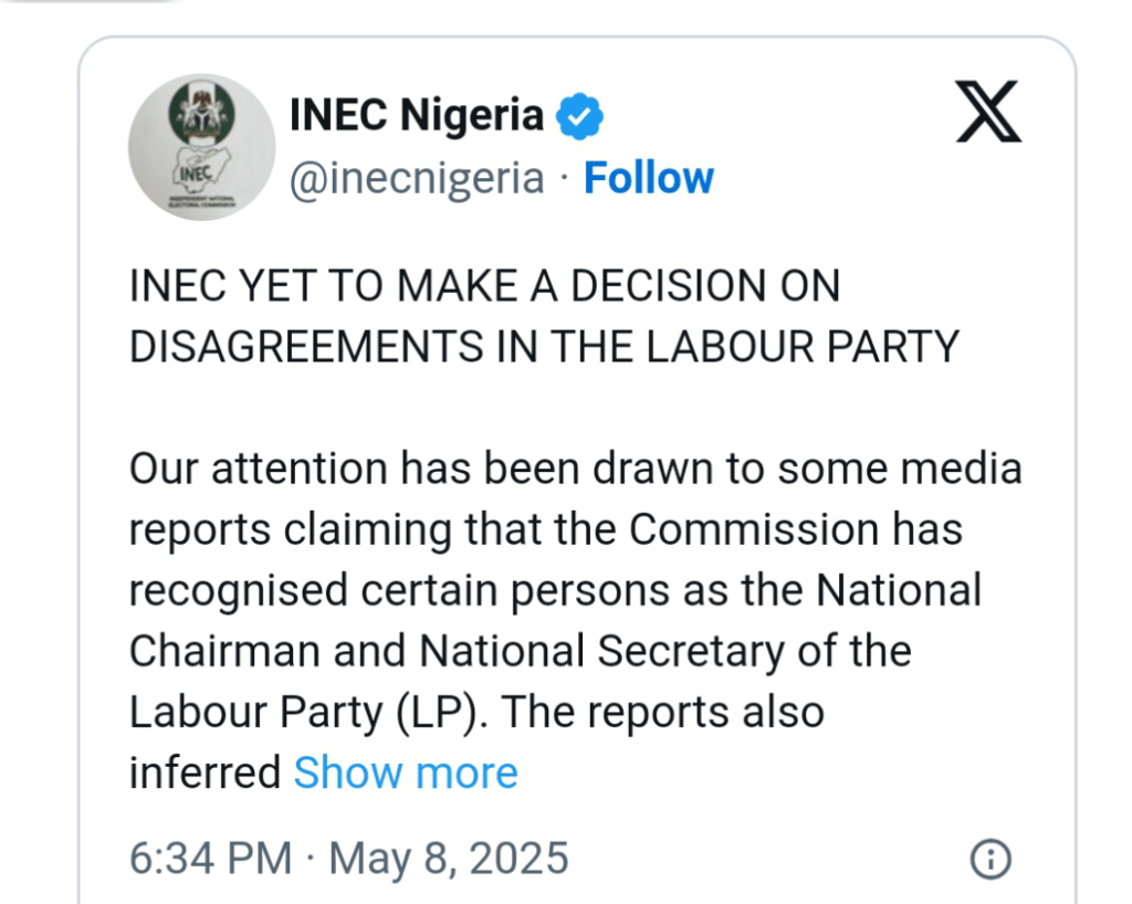 The Independent National Electoral Commission (INEC) has categorically denied reports suggesting it has recognised new leadership within the Labour Party (LP) and the Peoples Democratic Party (PDP), insisting that Julius Abure remains listed as the LP National Chairman—at least for now.