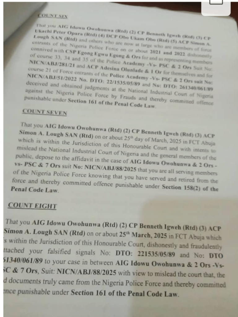 The IGP’s suit further alleges that Simon A. Lough (SAN) and others deposed false affidavits in March 2025, falsely claiming to be active-duty officers in another matter: AIG Idowu Owohunwa & Ors vs PSC & 7 Ors (NICN/ABJ/88/2025). The affidavit was allegedly used to lend credibility to their claims, despite the fact that the officers had already retired.