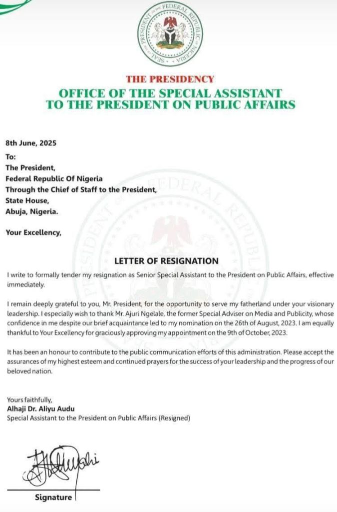 In his formal letter, Audu expressed deep gratitude to President Tinubu for the opportunity to serve, and acknowledged Ajuri Ngelale, the former Special Adviser on Media and Publicity, for nominating him for the role in August 2023, with official appointment granted in October 2023.