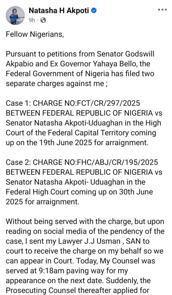Suspended Senator representing Kogi Central, Natasha Akpoti-Uduaghan, has broken her silence after the Nigerian government slammed her with two fresh criminal charges, a move she believes is politically motivated and rooted in vendettas by Senate President Godswill Akpabio and former Kogi State Governor Yahaya Bello.