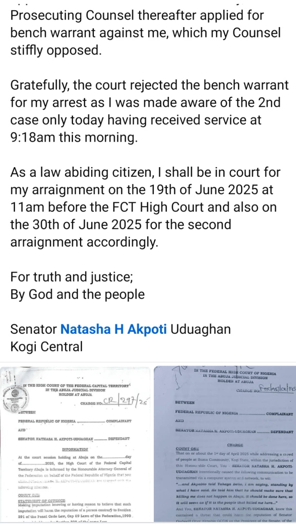 > “As a law-abiding citizen, I shall be in court for my arraignment on the 19th of June 2025 at 11am before the FCT High Court, and also on the 30th of June 2025 for the second arraignment accordingly,” Akpoti-Uduaghan stated.