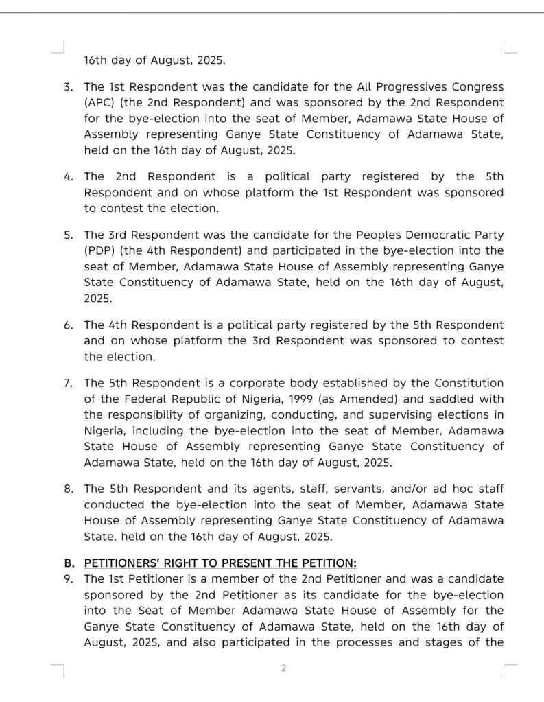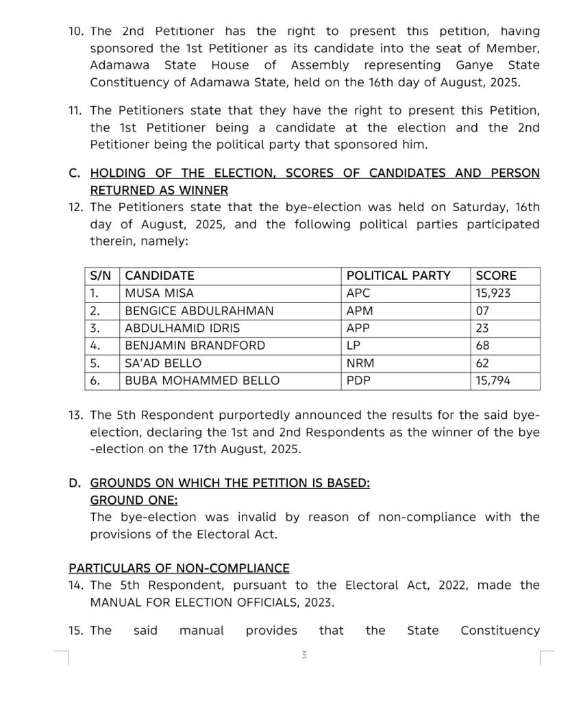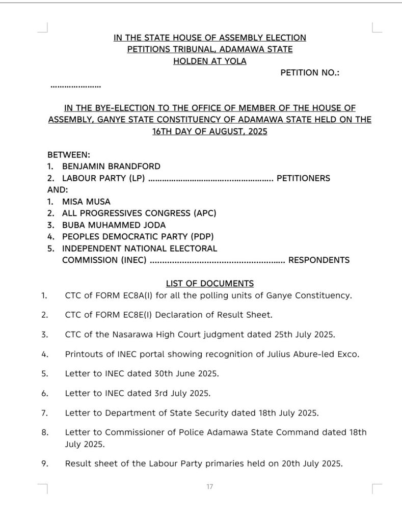 The dust is yet to settle on the August 16, 2025 Ganye State Constituency bye-election, as the Labour Party (LP) and its candidate, Benjamin Brandford, have taken the Independent National Electoral Commission (INEC) before the Adamawa State Election Petitions Tribunal, accusing the commission of brazen illegality and electoral sabotage.