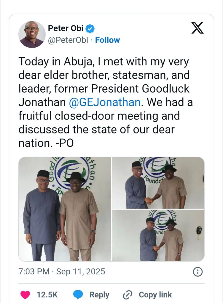 In what political observers are already describing as a potential game-changer, former Labour Party presidential candidate, Peter Obi, on Thursday held a high-stakes closed-door meeting with former President Goodluck Jonathan in Abuja.