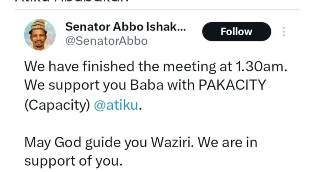 Taking to social media after the session, Abbo openly reaffirmed his loyalty to Atiku, hailing him as “Baba with capacity.”