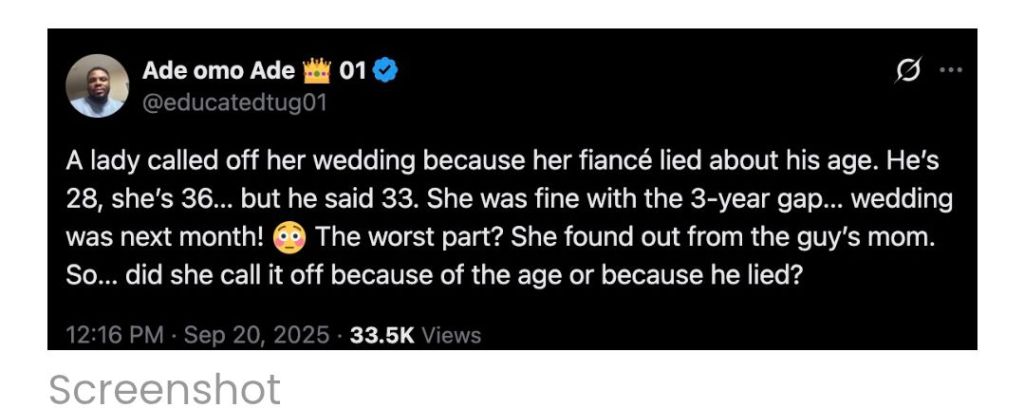 > “A lady called off her wedding because her fiancé lied about his age. He’s 28, she’s 36… but he said 33. She was fine with the 3-year gap… wedding was next month! 😳 The worst part? She found out from the guy’s mom. So… did she call it off because of the age or because he lied?”