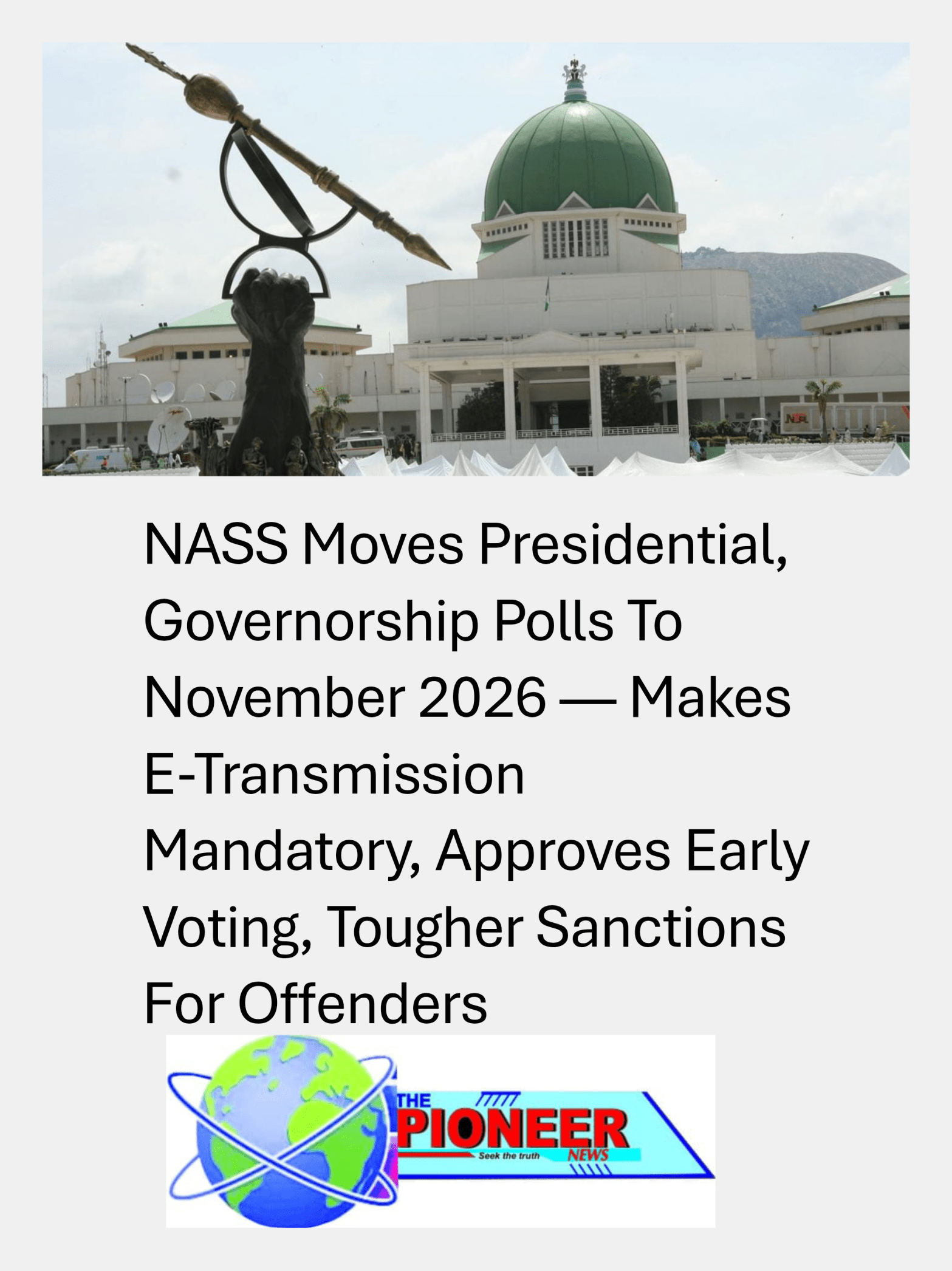 NASS Moves Presidential, Governorship Polls To November 2026 — Makes E-Transmission Mandatory, Approves Early Voting, Tougher Sanctions For Offenders