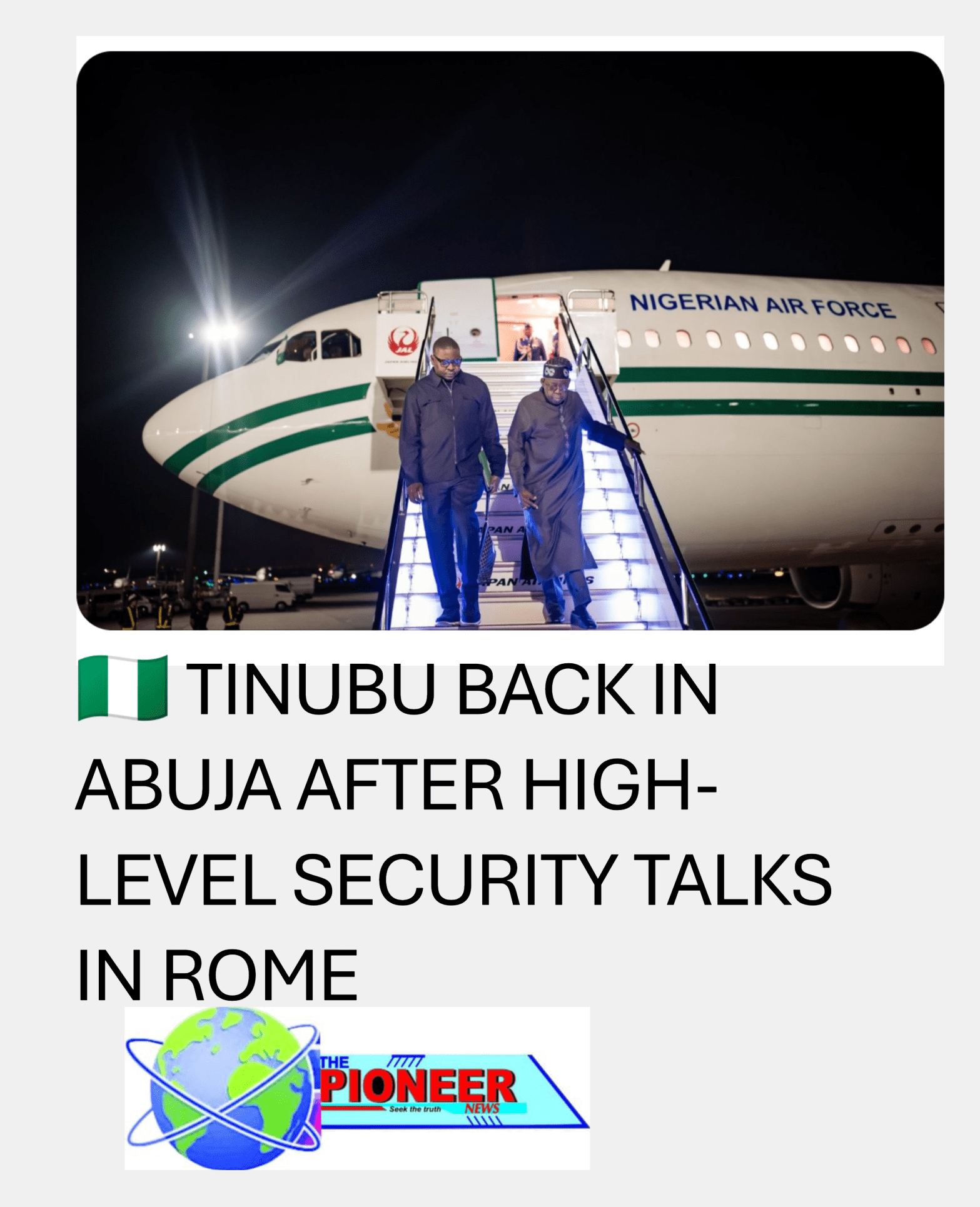 President Bola Ahmed Tinubu has returned to Abuja after a strategic visit to Rome, Italy, where he participated in the Aqaba Process Heads of State and Government Meeting — a top-tier global forum dedicated to strengthening international cooperation in the fight against terrorism and violent extremism.
