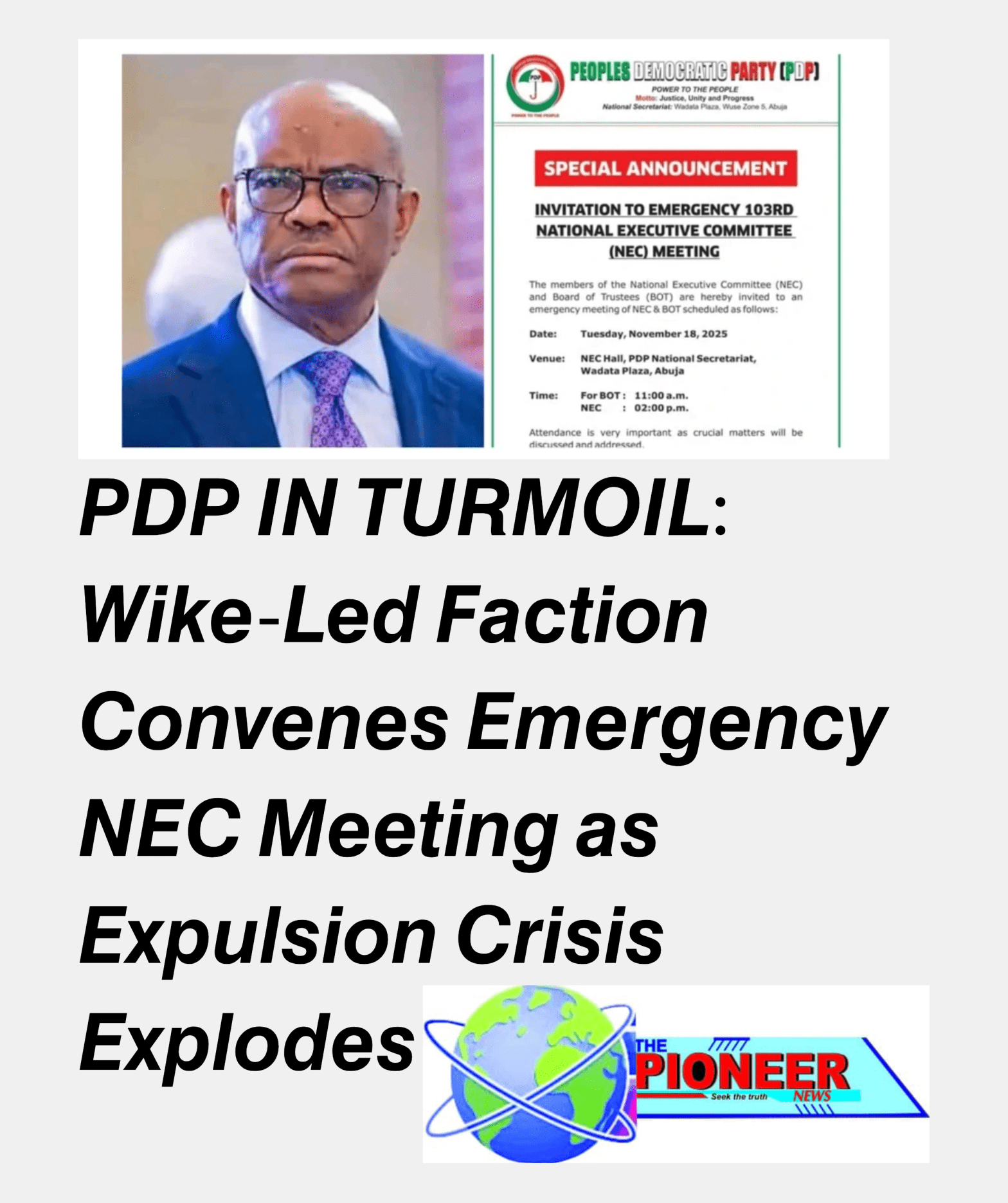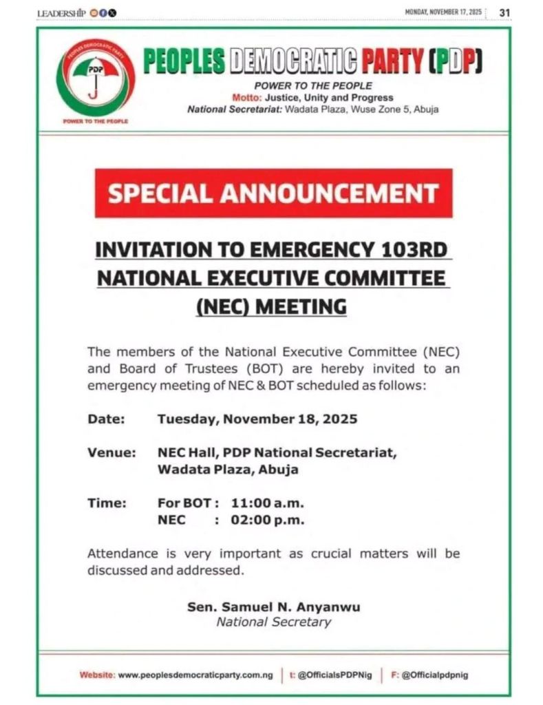This session marks the 103rd emergency NEC meeting in the party’s history — a clear sign of the PDP’s mounting internal unrest.