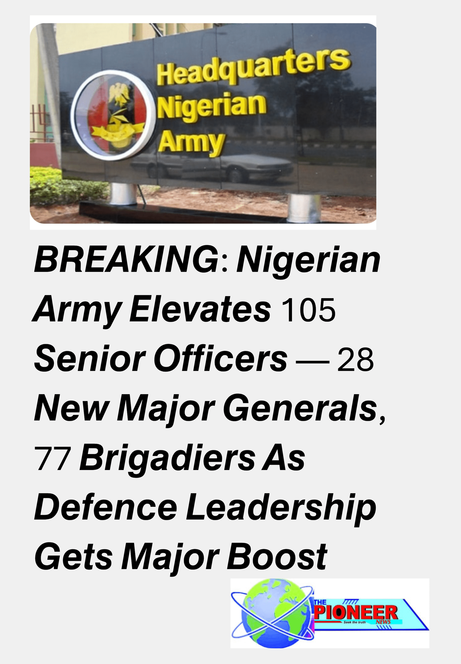 In a sweeping move aimed at strengthening Nigeria’s military command structure, the Nigerian Army Council has approved the promotion of 105 senior officers to the prestigious ranks of Major General and Brigadier General.