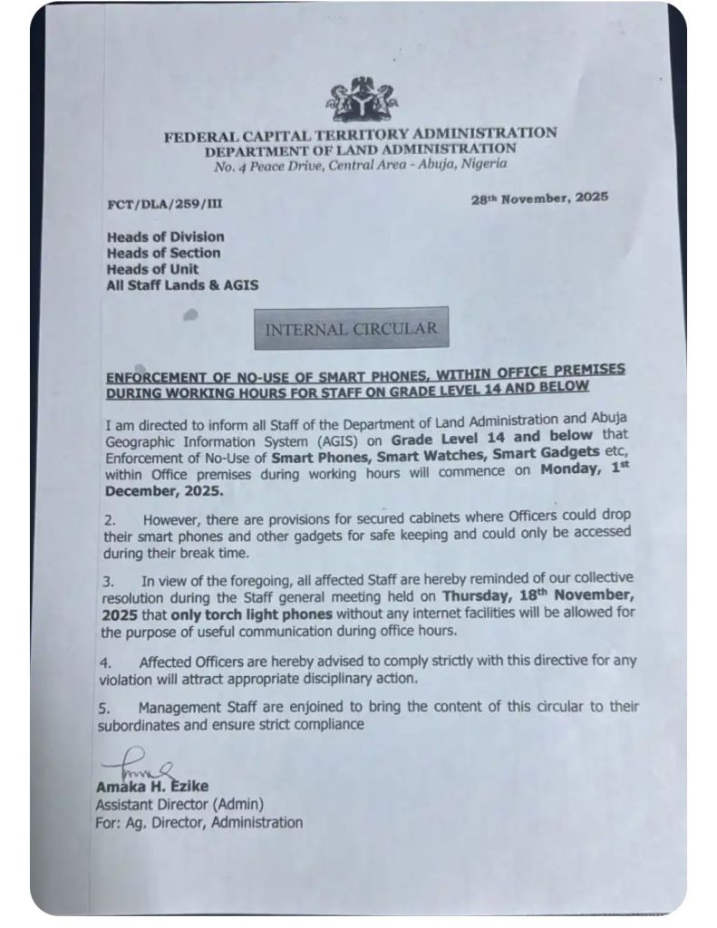 The circular, obtained by Sahara Reporters, also reaffirmed the outcome of a general staff meeting held on November 18, 2025, where workers purportedly consented that only basic torchlight phones—with no internet capabilities—would be permissible for essential communication during work hours.