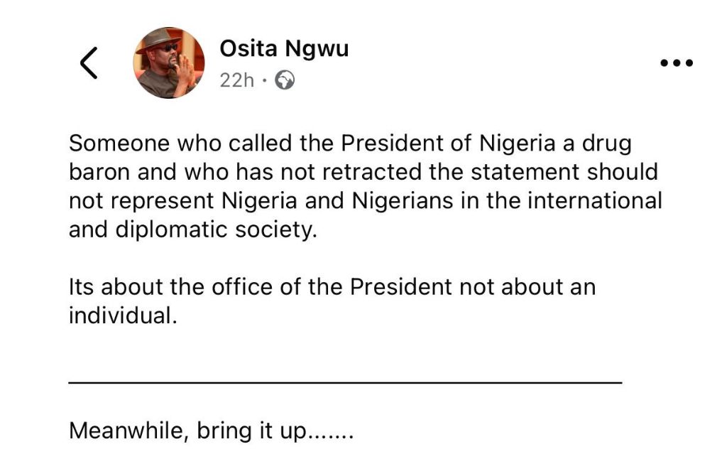 “Someone who called the President a drug baron and has not retracted it should not represent Nigeria and Nigerians in the international community. It is about the office of the President, not the individual.”