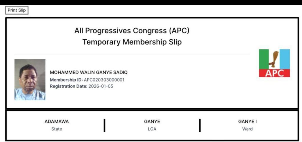 As the APC’s nationwide e-registration gathers momentum, the participation of figures like Alhaji Sadiq Mohammed Walin Ganye reinforces the party’s unity, depth, and readiness for the political battles ahead—anchored by experience, renewed by technology, and driven by a vision for a stronger Nigeria.