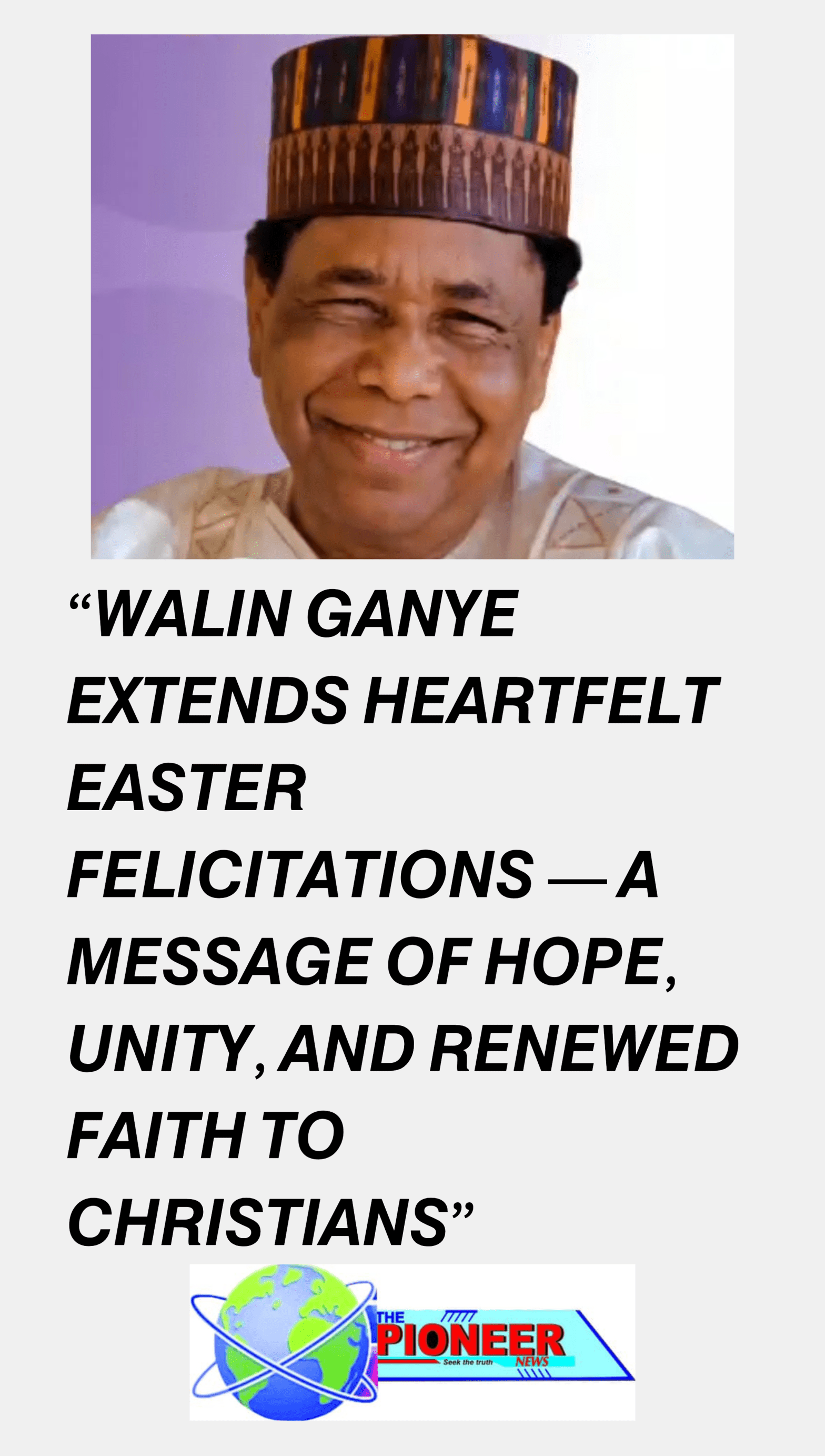 In a warm, graceful, and deeply inspiring message, Alhaji Sadiq Mohammed Walin Ganye has extended his heartfelt Easter greetings to Christians across Nigeria and beyond, celebrating the season as a powerful symbol of sacrifice, love, and victory over adversity.