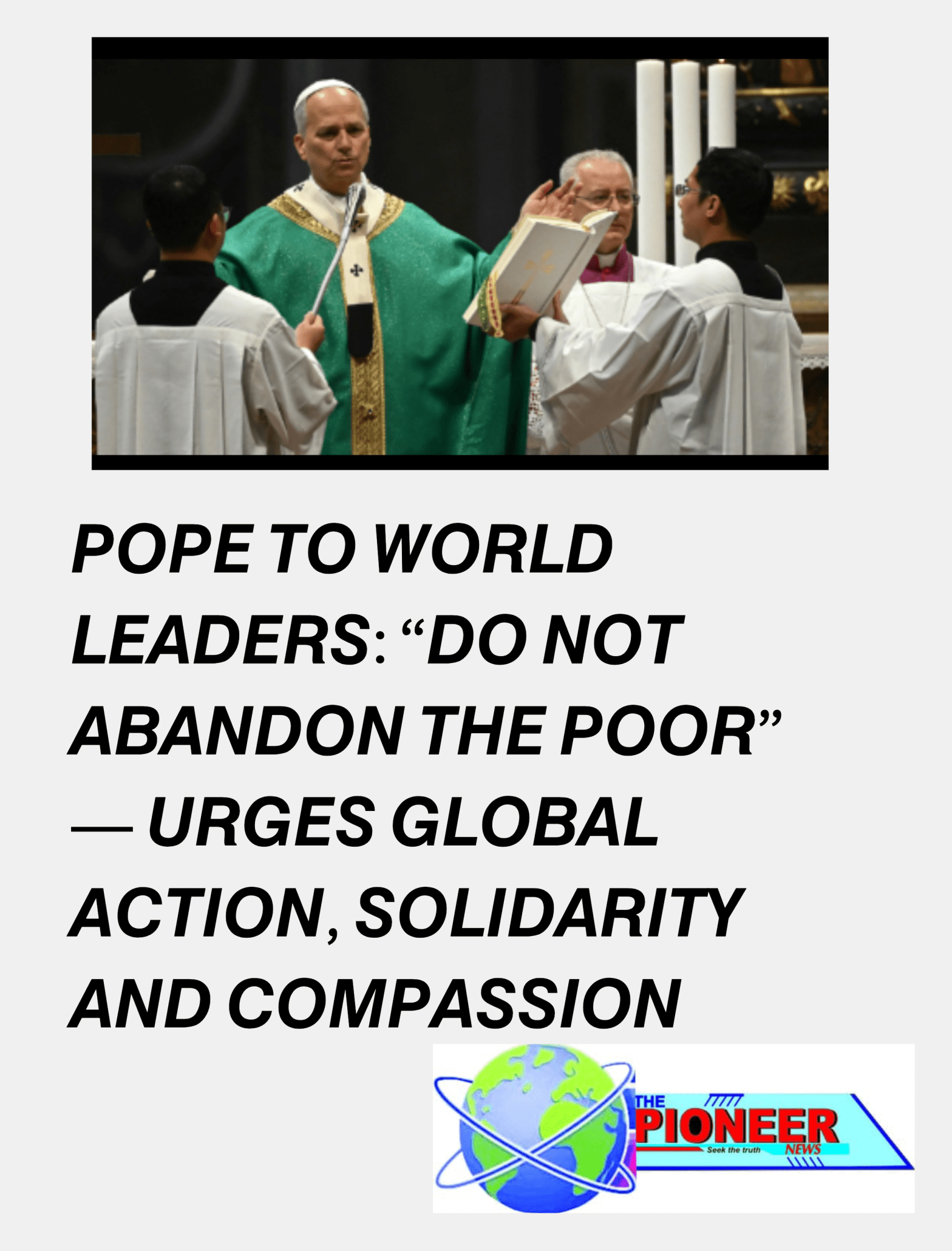 Pope Francis has issued a powerful appeal to world leaders, urging them not to turn their backs on the poor and vulnerable as global crises deepen. Speaking with characteristic conviction, the Pope called for urgent, coordinated action to alleviate hardship, reduce inequality, and restore dignity to millions living on the margins.In his message, the PontiffContinueContinue reading “POPE TO WORLD LEADERS: “DO NOT ABANDON THE POOR” — URGES GLOBAL ACTION, SOLIDARITY AND COMPASSION”