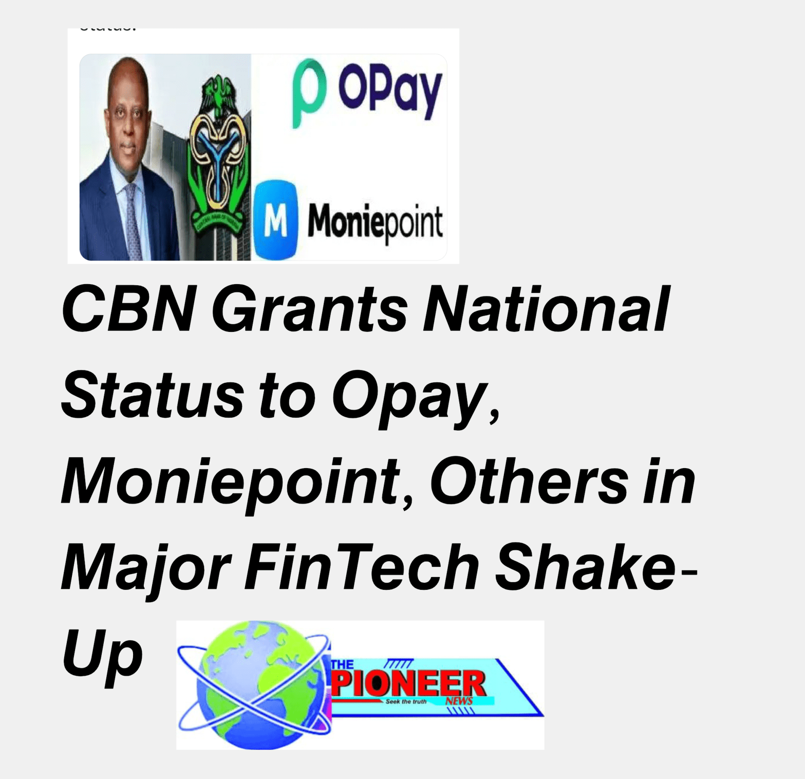 CBN Grants National Status to Opay, Moniepoint, Others in Major FinTech Shake-Up