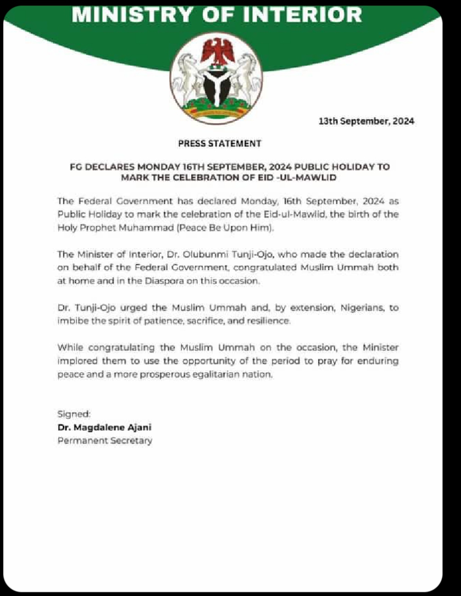 Federal Government Declares Monday Public Holiday for Eid-el-Maulud Celebration