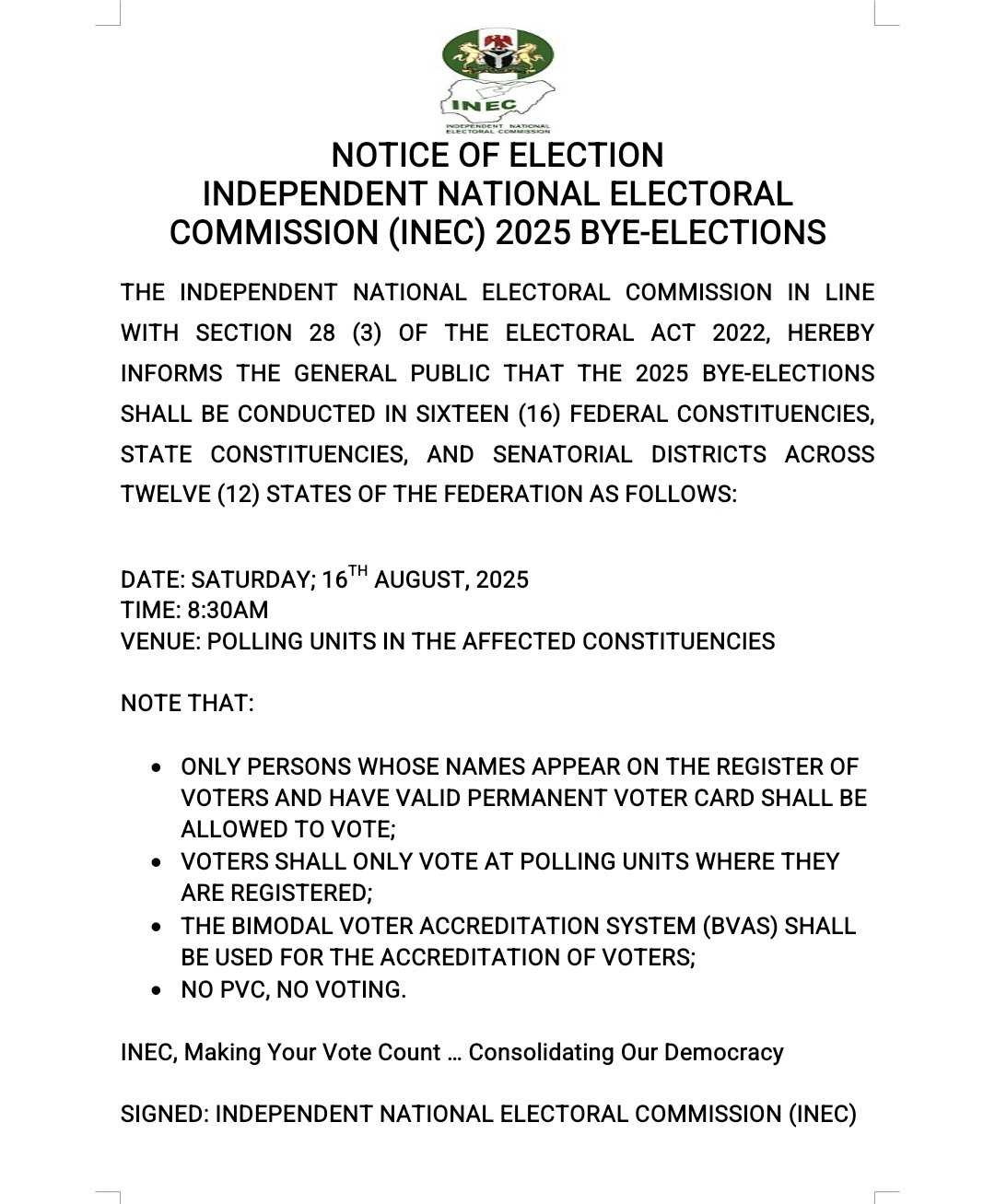 INEC Sets August 16 for Crucial 2025 Bye-Elections Across 12 States