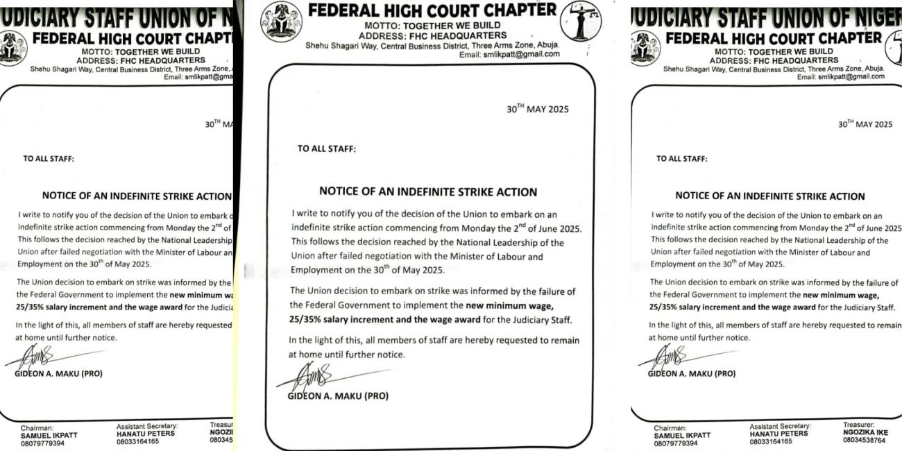 In a bold and unprecedented move, the Judiciary Staff Union of Nigeria (JUSUN), Federal High Court Chapter, has declared an indefinite nationwide strike, sending shockwaves across the country’s legal and political landscape. The industrial action, scheduled to commence Monday, June 2, stems from the federal government’s persistent failure to honor critical financial agreements made withContinueContinue reading “Judiciary in Crisis: JUSUN Declares Indefinite Nationwide Strike Over Unpaid Wages and Broken Promises”