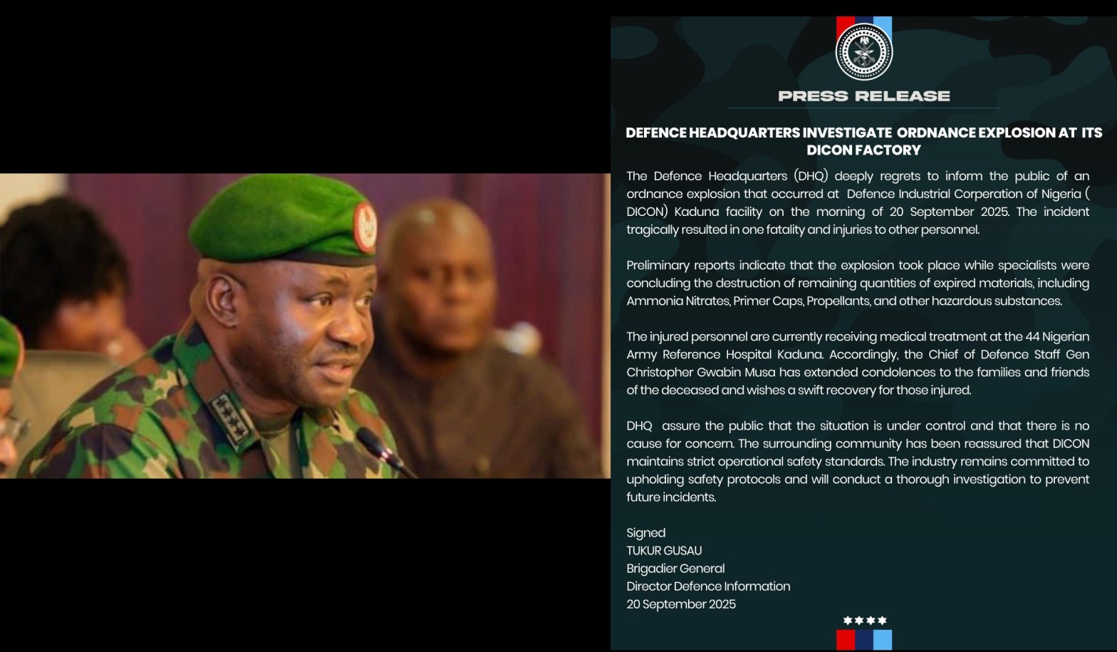 Kaduna, Nigeria – Tragedy struck in Kaduna on Saturday as a powerful explosion ripped through the Defence Industries Corporation of Nigeria (DICON) factory, leaving one dead and several injured. The deafening blast, which shook homes across Chikun and Kaduna South Local Government Areas, has sent shockwaves through the state and raised fresh questions about safetyContinueContinue reading “DICON EXPLOSION ROCKS KADUNA: DEFENCE HEADQUARTERS LAUNCHES PROBE, MOURNS VICTIMS”