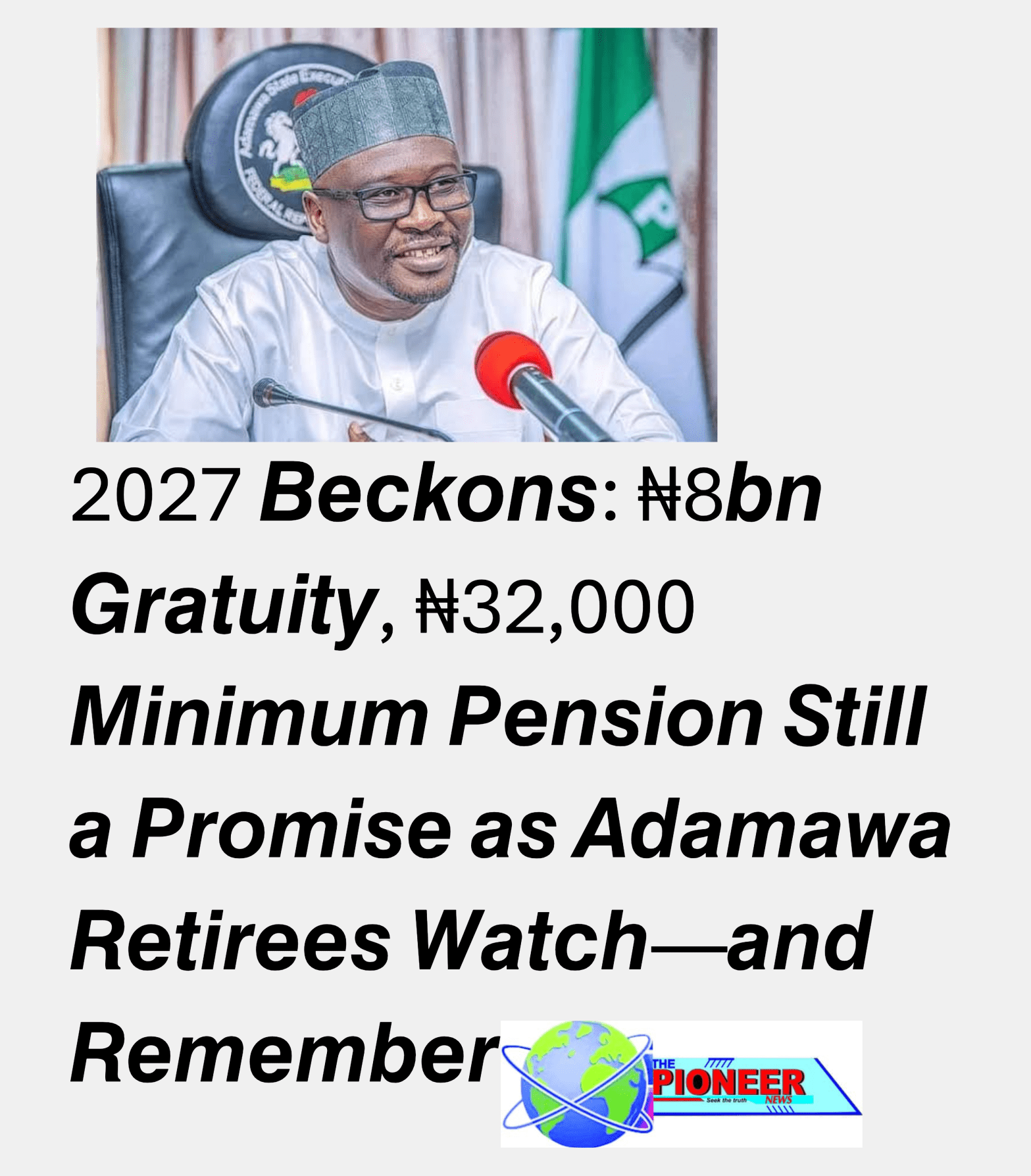 As the 2027 general elections draw closer, the silence surrounding Adamawa’s unpaid retirees is becoming louder—and more politically consequential. Governor Ahmadu Umaru Fintiri’s much-publicised approvals and promises are yet to translate into relief for those who carried the state on their shoulders for decades.In 2024, the governor approved ₦8 billion to clear gratuity backlogs forContinueContinue reading “2027 Beckons: ₦8bn Gratuity, ₦32,000 Minimum Pension Still a Promise as Adamawa Retirees Watch—and Remember”