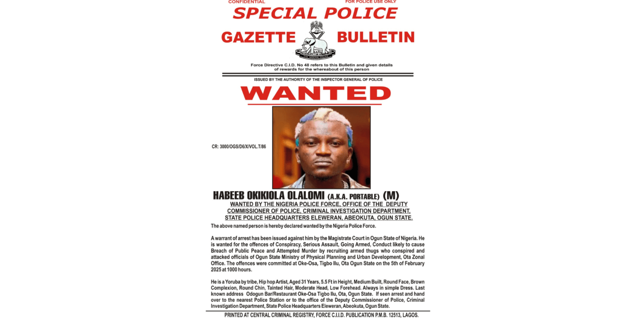 The Ogun State Police Command has issued a warrant for the arrest of the controversial street singer, Habeeb Okikiola Olalomi, better known as Portable, following his alleged involvement in a violent attack on government officials performing their lawful duties.In an official statement released on Tuesday by the command's spokesperson, Omolola Odutola, the police confirmed thatContinue reading "Police Declare Portable Wanted for Violent Assault on Ogun Government Officials"