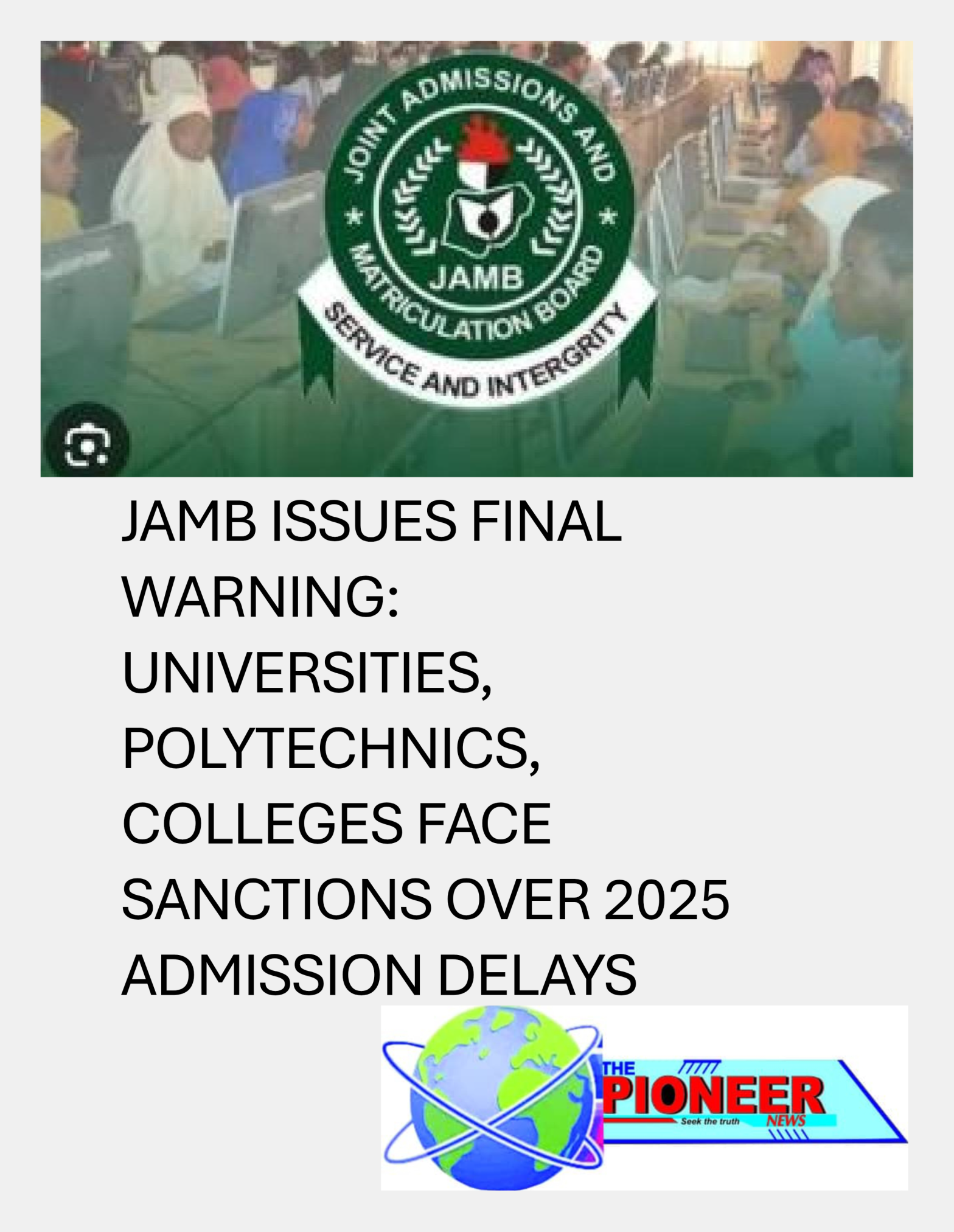 Board fixes October–December deadlines; names defaulting institutions; vows to reassign unprocessed candidates to other schools. The Joint Admissions and Matriculation Board (JAMB) has drawn the battle line for all tertiary institutions in Nigeria, announcing strict deadlines for the 2025 admission exercise and warning that any university, polytechnic, or college that fails to meet the setContinue reading "JAMB ISSUES FINAL WARNING: UNIVERSITIES, POLYTECHNICS, COLLEGES FACE SANCTIONS OVER 2025 ADMISSION DELAYS"