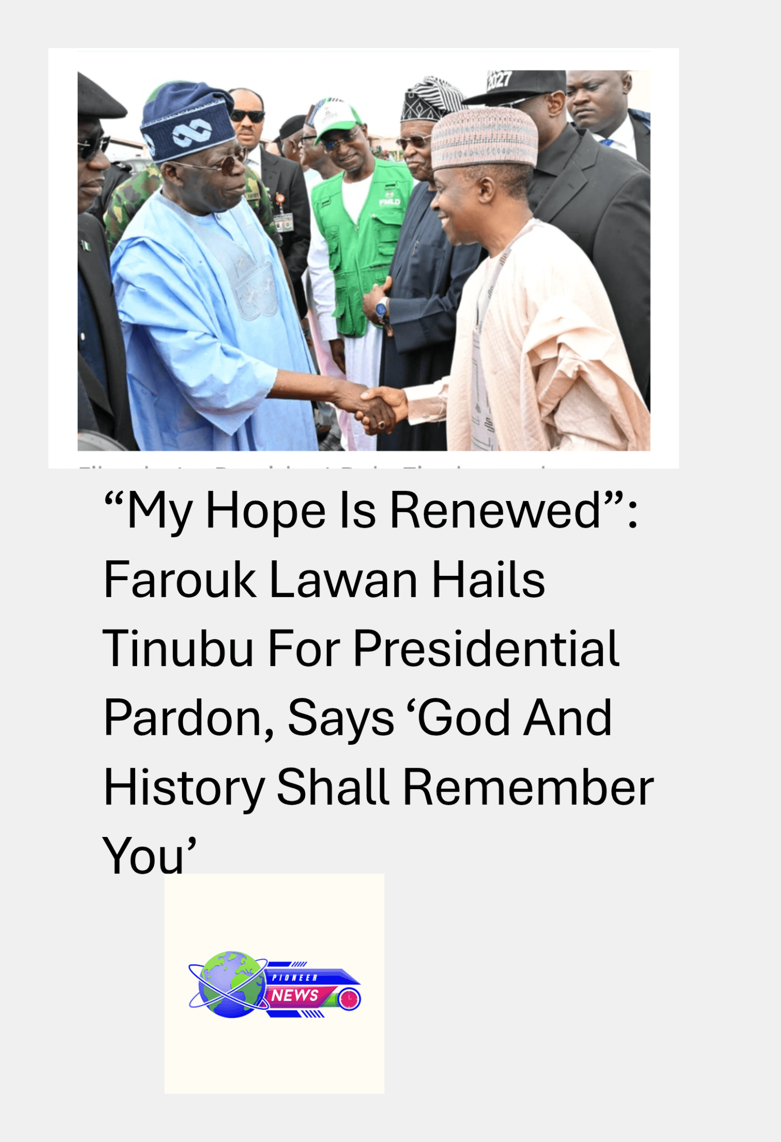 Former House of Representatives member, Farouk Lawan, has expressed deep gratitude to President Bola Ahmed Tinubu for granting him a presidential pardon, describing the gesture as a divine act that has “renewed his hope” and restored his faith in Nigeria’s justice system.Lawan, who represented Bagwai/Shanono Federal Constituency of Kano State, was a prominent figure inContinue reading "“My Hope Is Renewed”: Farouk Lawan Hails Tinubu For Presidential Pardon, Says ‘God And History Shall Remember You’"