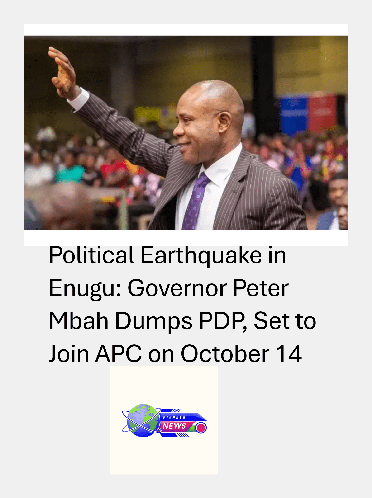In what observers are describing as a major political realignment with far-reaching implications for the 2027 elections, Governor Peter Mbah of Enugu State is set to formally defect from the Peoples Democratic Party (PDP) to the ruling All Progressives Congress (APC) on Tuesday, October 14, 2025, in Enugu, the state capital.The move, which has beenContinue reading "Political Earthquake in Enugu: Governor Peter Mbah Dumps PDP, Set to Join APC on October 14"