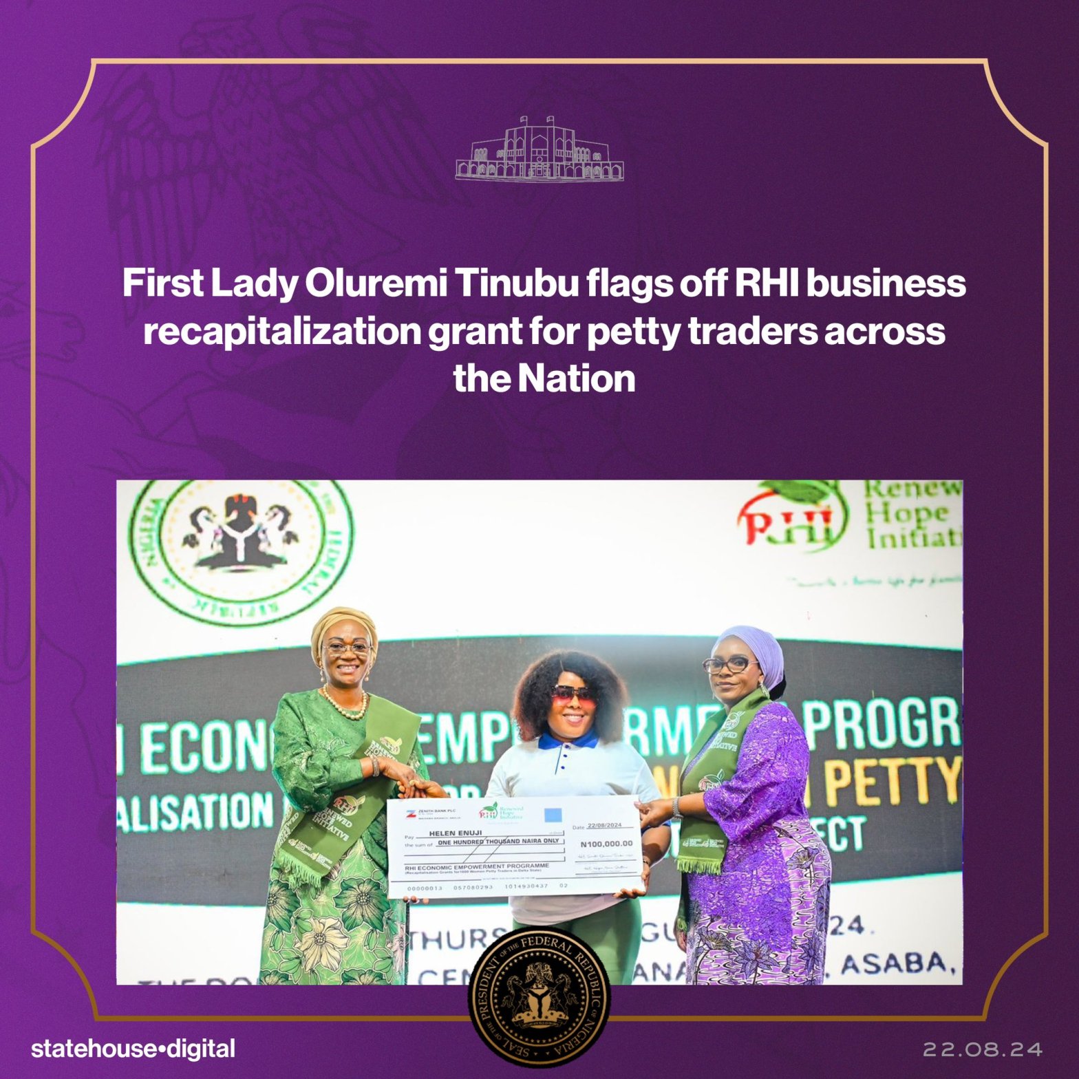 The Presidency of Nigeria, through its official X (formerly Twitter) channel, has proudly announced the launch of a transformative initiative spearheaded by the First Lady, Oluremi Tinubu. In a decisive move to empower petty traders across the nation, the First Lady has officially flagged off the RHI Business Recapitalization Grant, a program designed to breatheContinue reading "First Lady Oluremi Tinubu Launches Nationwide RHI Business Recapitalization Grant for Petty Traders"